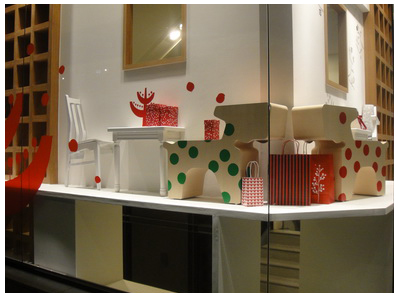 櫥窗設計應聖誕節的到來,很有節慶的感覺,白色的明亮感,搭配木頭的隔層,真的很漂亮。有一種很乾淨,又很簡潔的摩登時尚。旁邊的廣告打著2010誠品月曆、耶卡以及禮物展的廣告橫幅。