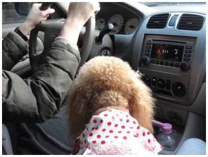 但他有個壞習慣,就是他很喜歡跑去駕駛座的位置,其實有時候是有點危險.....但如果在郊外,慢慢開就還好,看他伺機而動,就是準備要跳過來我這邊的駕駛座。