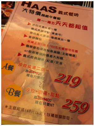 價位由低至高也是義大利麵然後週一至週五要A、B套餐可以選擇