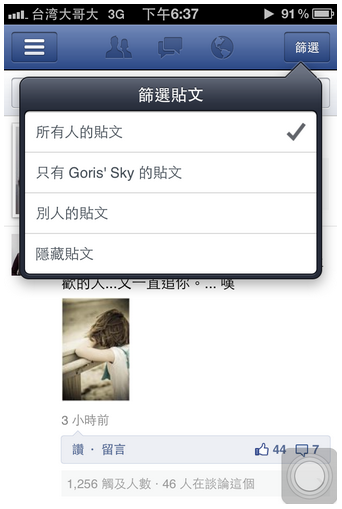 上面刊頭的部分,基本上就只分五個按鈕,首先是「篩選」的部分,主要就是用來篩選文章呈現的方式,可能是所有人的貼文,也可以是只有管理者自己的貼文,或者就是粉絲的貼文等...就是文章呈現方式的過濾。