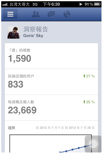 然後,前陣子web版的粉絲專頁,管理員能夠看到更詳盡的分析報告,在手機版上,也被移植了些簡單的數據報告過來,但大概就是簡單透過手機看個趨勢,要再看更詳細的數據,還是得到web版。