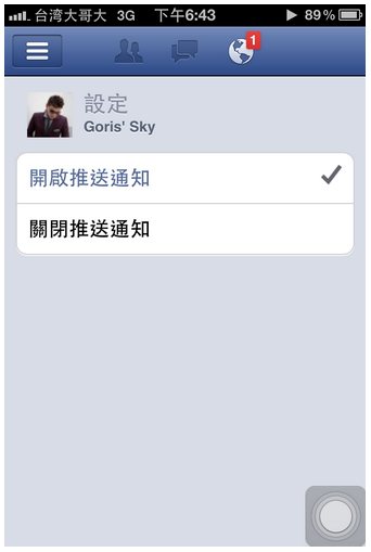 最後,有一個比較有趣的就是「設定」中的推送通知,相信有些人根本就是Facebook的重度使用者,很享受手機傳來Facebook的更新訊息,但真得一但朋友很多,你的手機大概整天也都響不完吧。