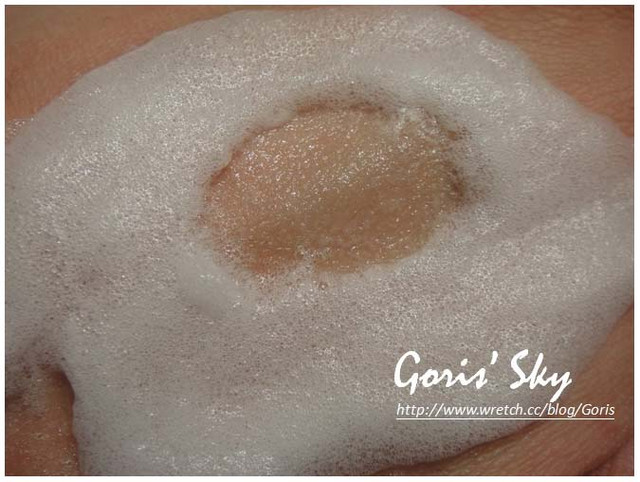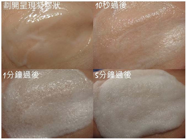 剛開始"塗抹"後,帶一點香芬。大概平整塗抹於自己臉上,不需要太厚,只需要平整塗抹於臉部肌膚每一個部份即可;很快地,大概10秒就開始發泡了...凝膠質地整個就是開始發泡,你都能聽到泡沫在啪啪啪啪產生的聲音;大概1分鐘過後,就發泡的蠻完整的,還以為差不多發泡就是這樣了,沒想到大概在5分鐘後,泡沫又顯得更濃密,更細緻了,整個就是太好玩了吧...,很細緻綿密的白色泡沫,就這樣包覆在臉上。