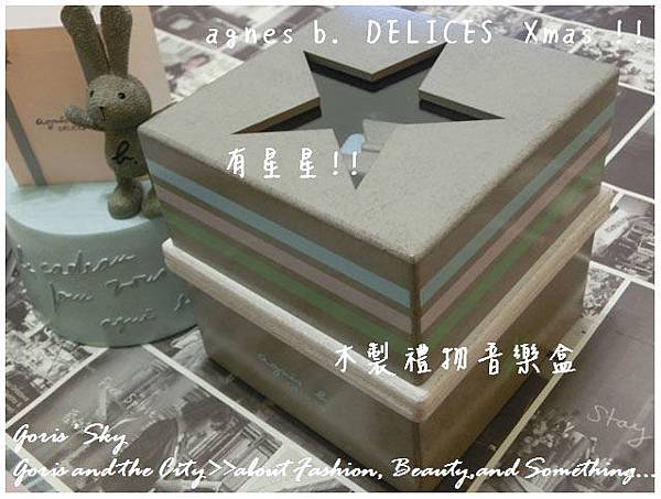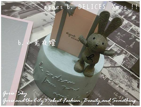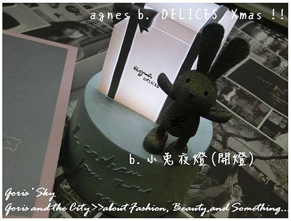 這次的agnes b. DELICES Xmas組合中,最吸引人的確實就是這b.小兔夜燈,有一支經典的b.小兔公仔直立立的站著,敞開雙手的樣子確實也是很可愛,後面的禮物盒打著Tiffany藍的緞帶,也是主要的夜燈燈箱。