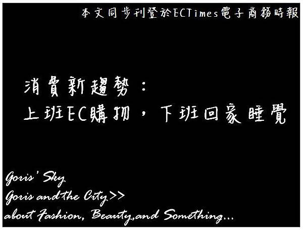再加上,那原本都需要去百貨公司買的東西,現在在網路上都買的到了,甚至在優惠折扣下,更是天天都能是百貨週年慶,甚至比百貨週年慶更加划算,那我就每週一到週五在網路上購買或者等待每日好康的一日限定,當我於平常上班都解決掉週六日或者是下班才能去的百貨公司同時,我原本的時間就能用來作休息或是其它的事情,也就成為相當標準的上班EC購物,下班回家睡覺。