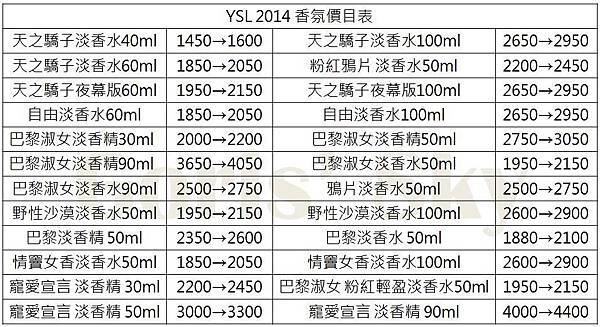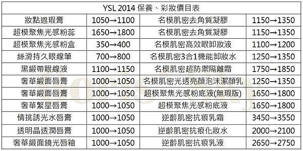 日前網路上已經有人整理關於YSL的彩妝調漲價目表,這邊除了整理來自網友的彩妝部分,同時也再整理保養和香水。彩妝的部分,唇彩類基本上就是全面調漲,從1000元調整至1050,屬於CHANEL和Dior之前的唇膏價格。彩妝主要調整最多得是粉底液,包括原超模聚焦光感粉底液和無瑕版,以及粉蕊的部分都做了調整,都是漲足150元,倒是2013下半年新上市的逆齡肌密精萃粉底則不在此波漲價行列,目前現階段,YSL將會全力主攻情挑誘吻水唇蜜,從國外網站得知,YSL 也將會推出逆齡綻白彩妝系列,這會是比較值得期待的部分。基礎保養上以及逆齡肌密系列也都有部分商品作調漲,惟逆齡系列中,我覺得最好用的逆齡肌密眼霜、精華液甚至是明采筆等...,也都不在這一波的漲價範圍,算是值得欣喜的部分。