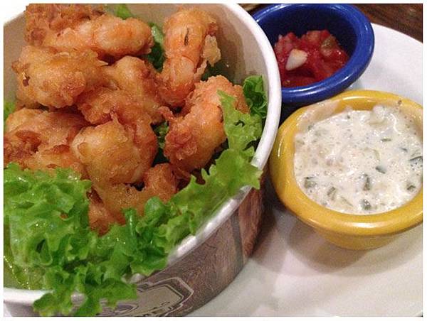 這蠻特別的,但也很貴 ...,不要以為它滿滿一碗,其實大概量就只有你肉眼看的這些,下面都是生菜 ... 我是真的覺得275元這樣好貴,但畢竟是蝦 ! 它有點像鳳梨蝦球的蝦球,其實是真的很好吃,搭配的佐醬有兩種,一種是塔塔醬,另一種是酸甜醬,酸甜醬不是很好吃 ... 應該是不太搭,塔塔醬的搭配比較可口。