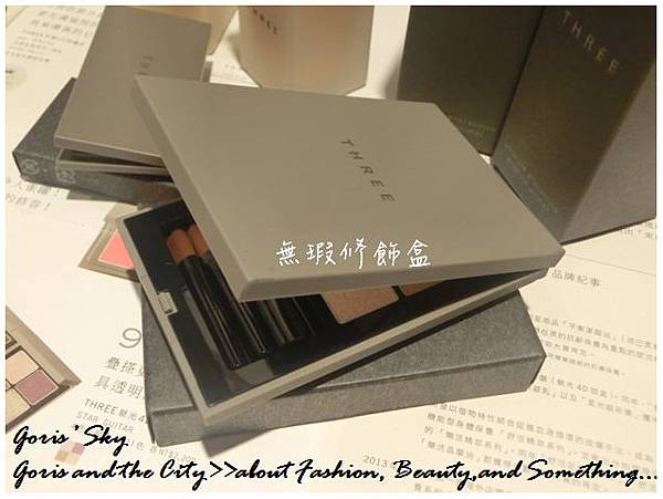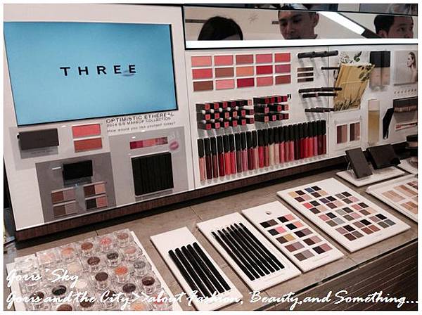 櫃上的彩妝陳設,不過之前我用的那罐不很好用的粉底,原來沒上市,應該就是之前價目表的凝光水粉霜,現場沒看到...,該不會是我寫很悲劇,台灣就不上了...,不過,據說THREE也要出新粉底了,如果說是該罐粉底的升級版,確實不上市也應該,畢竟在台灣使用真的很悲劇,倒不如直接等新品發售再看看,比較好玩的是迷光眼采粉,有點像MAC的魔幻星塵,就是粉狀的,全部都陳列在上頭很漂亮,摸起來也很有趣。