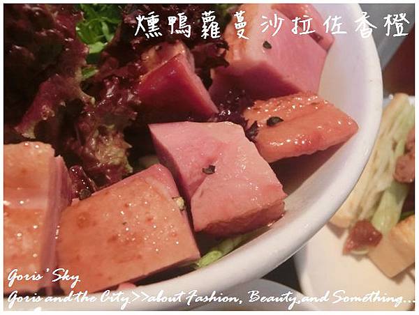 首先,這個燻鴨蘿蔓沙拉佐香橙裡頭其實已經有沙拉醬,但不至於太重,所以一旁的香橙醬,你可以酌量添加即可,但因為我本身喜歡酸甜的口味,我還是會全加進去 !! 你就看這樣濕淋淋的伴隨香橙醬 ... 實在相當令人食指大動,而且不由自主都一直吞口水。