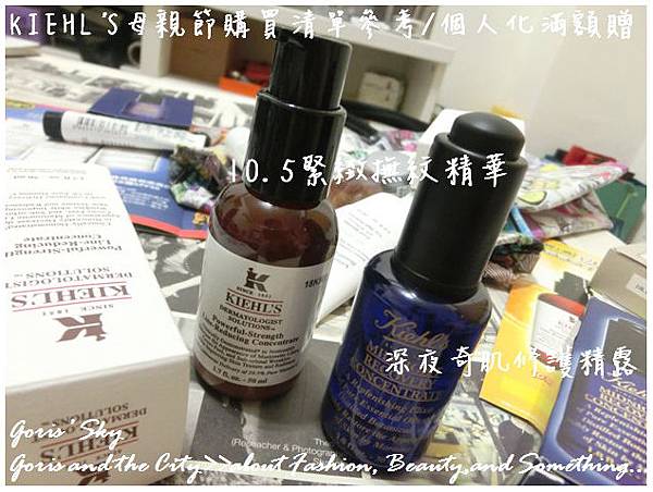 然後就是這兩瓶精華液,分別是10.5緊緻撫紋精華和深夜奇肌修護精露,這兩瓶精華液其實早在KIEHL'S都還沒開始做相關行銷活動時,好幾年前我就用過,其中,也很喜歡10.5緊緻撫紋精華,在我還在作專櫃時,這瓶10.5緊緻撫紋精華就一直是我們專櫃人員口耳相傳的C好物,主要是它高達10.5%的左旋C成份,當然,左旋C其實就是維他命C,但是透過左旋的方式,可以讓肌膚吸收更好,然後達到如其名10.5緊緻撫紋精華的訴求和效果,擦上臉上還會有點熱熱的感覺,對於一些修護甚至是一些撫紋訴求上,都有不錯的效果,重點是我一直都覺得它好便宜...,50ML的精華液才2550元,還友大容量75ML只要2950元,這真的是在別的品牌的精華液看不到的價格;深夜奇肌修護精露我則是在2012年8月就寫過心得了 ...,我後來也有點意外KIEHL'S 把這瓶看的好重 ...,我覺得年輕的時候你還不會需要油,但開始有些年紀後,你會感受到油的保養必要性,因為肌膚開始乾,油的延展以及滲透性,和滋潤度都會來的更佳,特別是夜間保養的長效性,油的保養也會擁有更好的效果,就輕輕滴一滴,就可用全臉了 ..,用量非常省,也有不錯效果,如果你真的怕直接擦上去的油膩感,你可以混合10.5緊緻撫紋精華,又或者是混合其它精華液,甚至是滴一滴在最後的乳霜中,就可以降低這對精露的疑慮,而且這瓶深夜奇肌修護精露,那個帶薰衣草的迷迭香 ...,用起來實在是超舒服和超讓人放鬆的,我會喜歡用完後,稍微再把手放在鼻前輕聞,真的很舒壓很幫助放鬆,然後雖然說是油,但其實也真的相當清爽也好吸收,真的晚上就輕輕給肌膚一滴 ...,就能很感受到肌膚更平滑、更柔嫩的感覺 ...,重點是這兩瓶也很適合媽媽使用,剛好各買一瓶也可以一起跟媽媽使用(說不定媽媽還會幫你出錢 ...哈)