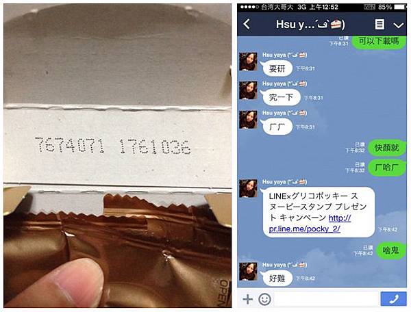 活動已經開始了,所以日本都開始有鋪貨Snoopy版Pocky,拆開來後,都會有一組序號,然後於LINE的視窗貼上 http://pr.line.me/pocky_2/ 這個連結,就同樣隨便丟一個朋友,然後用手機點開來。
