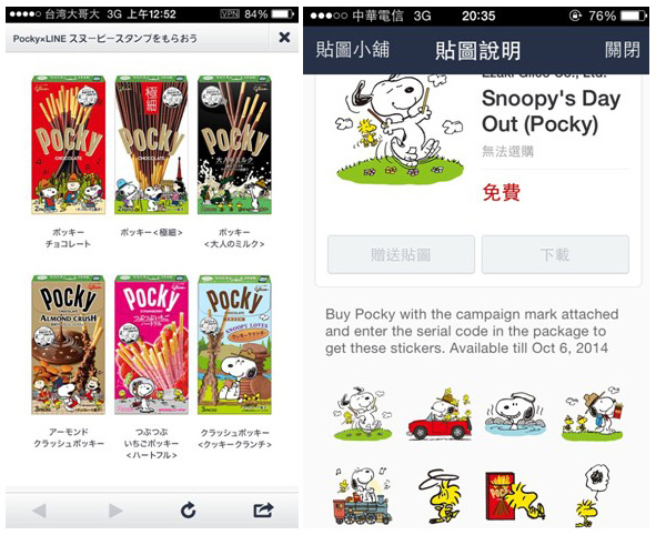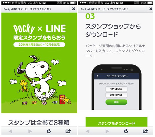 這陣子日本Pocky找來Snoopy做聯名限定包裝,一共針對6種口味設計五套不同的Snoopy的概念,營造出Snoopy也愛Pocky的概念,在過去,可能單純這樣就結束了,畢竟食品和一個icon做了聯名就已經很厲害了,不過現在行銷活動常常都要分線上和線下,畢竟網路的發達,網路的擴散才能達最後一哩,所以,這次Pocky不只和Snoopy聯名,再繼續和LINE合作推出相關貼圖,只要買Snoopy包裝的Pocky,就能得到一組序號下載限量Snoopy貼圖。
