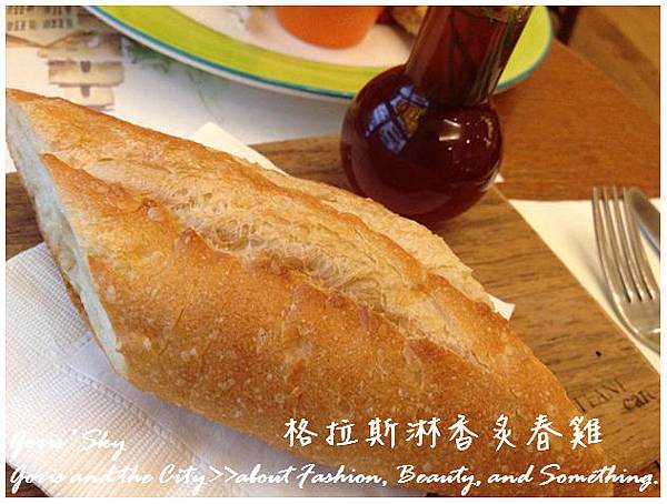 附有一塊法國麵包,旁邊拌有慢熬燉煮的醍醐色醇香雞汁,可以適量適時的加入主食中拌勻,法國麵包的部份有些硬,可以沾取格拉斯淋香炙春雞去做搭配食用,好吃多了,也香多了。