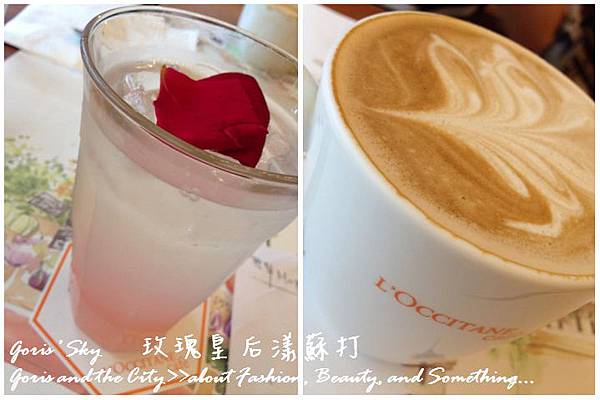 這陣子很迷戀agnes b. CAFE的玫瑰拿鐵,因為都會灑上細小的玫瑰花瓣,很浪漫,也很香,結果來到L'OCCITANE歐舒丹 CAFE,看到也有這款玫瑰皇后漾蘇打,直接是把整片玫瑰花給放在上頭 ...,但這是不能吃的,但實在也是挺浪漫,粉紅色的飲料,拌有玫瑰香,作成蘇打形式,很像喝汽水的感覺,但最主要還是這玫瑰花辦視覺大勝,很浪漫的玫瑰氣水,也是第一次喝到玫瑰的汽水,說好喝是還好,單純是新奇。