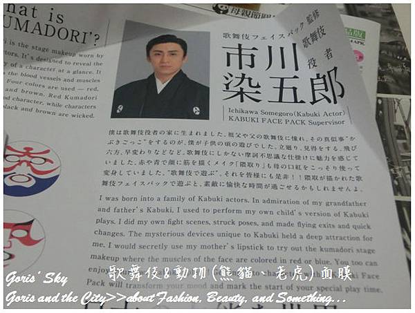 沒有另外的說明書、說明紙,打開來就是概念企劃和相關說明,不只日文,更包括英文的介紹,也能比較了解這個歌舞伎的面膜設計概念。其中,這個市川染五郎是歌舞伎演員、演員同時也是舞踴家。日本舞蹈松本流掌門人。市川出生於歌舞伎世家,其父是第九代松本幸四郎,其妹是電視紅星松隆子。