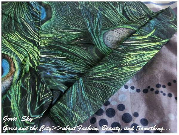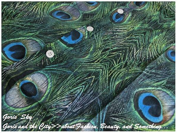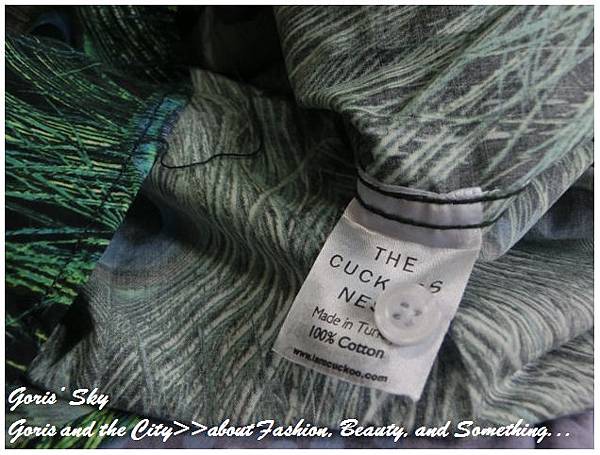 整件衣服攤開來看,可以大概看出版型是略收身的,但同時也留有下擺可供紮進,翠綠的孔雀花紋,搭配純白色的鈕扣也顯得相當亮眼,胸口的部份還有個小口袋供裝飾使用,重點是整件衣服看起來深、沉,宛如有一種很強大的迷惑力,一直不斷地把你吸引進去,這就是我覺得CUCKOO一貫以來,服飾上最大的特色。