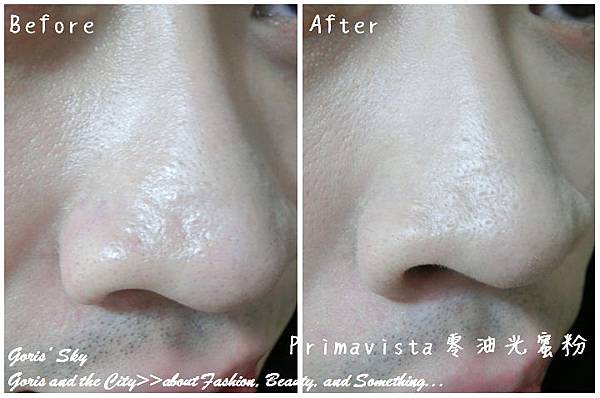 實際使用,左邊是已經泛滿油光...,然後我喜歡拿類似MAC#134的大型蜜粉刷去刷,刷起來比較鬆,也比較好上,特別是像這樣 Primavista零油光蜜粉比較鬆,更適合這樣鬆鬆的刷,你會看見刷完後鼻頭瞬間乾爽,但不是疊一層很厚的粉,而就是一種很輕爽,同時也清爽的感覺,但重點是,它不會過度粉霧,我其實會有點怕那種吸油後會很粉霧的蜜粉,也會會很浮,很不自然,但如果說你是粉底液後的定妝,其實粉霧就還好,但如果是出油後的粉霧,就會很可怕,像這款Primavista零油光蜜粉,使用起來就是淨爽又清爽。