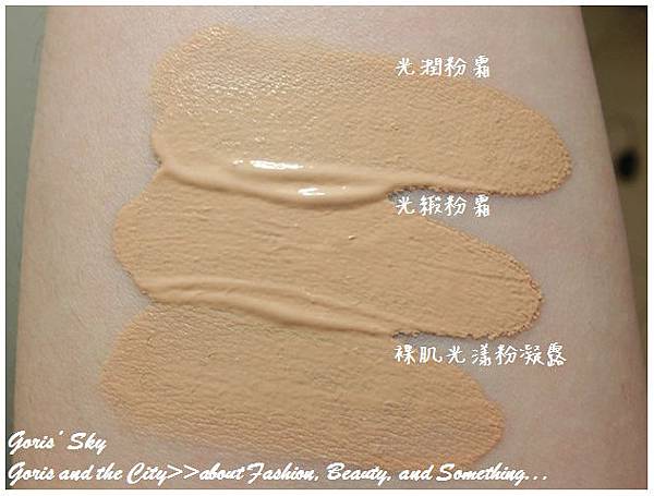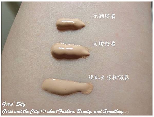 試著再將光緞粉霜、光潤粉霜以及新的裸肌光漾粉凝露三者輕輕劃開,你能看見光潤粉霜相對霧一些,質地稠一些,光緞粉霜水潤一點,光澤感也較佳,新的裸肌光漾粉凝露就真的比較薄,比較水,比較透,單就這樣,就能簡單感受到光緞粉霜、光潤粉霜以及新的裸肌光漾粉凝露三者的基礎分別。