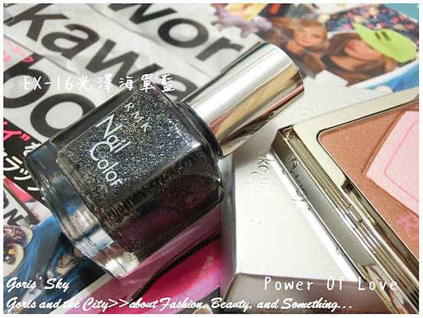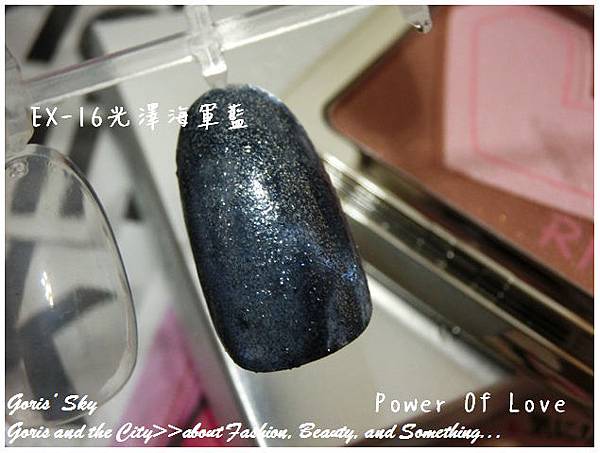 RMK的絕色指甲油一直都是便宜(訂價只要550元),也相當好畫的一個產品,顏色推出也常常相當具試驗性,特別是在限量季節彩妝中,總容易找到驚喜色,這次的Power Of Love限量秋妝中,共有5款新色,包括EX-16光澤海軍藍、EX-17光澤勃根地酒紅色、EX-18光澤粉紅、EX-19粉霧紅、EX-20粉霧棕,但我自己特別喜歡這款EX-16光澤海軍藍,實在是好看到相當厲害 ...,近似黑色,卻是一種墨藍色,然後由大量的珠光堆疊而成。