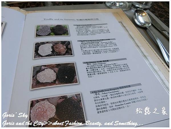 menu呈上大概也有基礎的松露介紹,松露之家的松露主要為四種,包括黑松露、夏松露、阿爾巴白松露、勃根地松露四種,也有基本的介紹,每一個松露也都有自己的定價,按g算,不過套餐的部分多是有部分的現刨松露作為點綴,除你要另外再家,就會有所不同的計價。