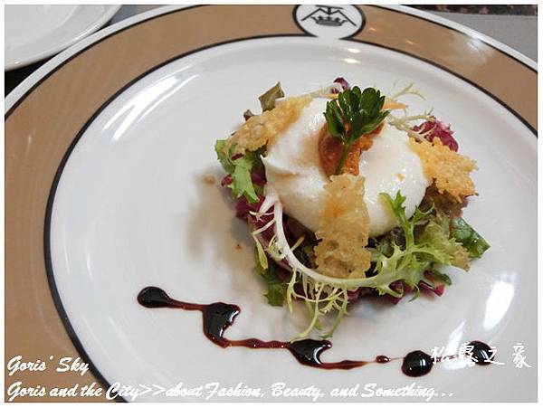 前菜的部分有生命之卵海膽沙拉以及晨曙之光蘆筍蘑菇凍,選擇的是生命之卵海膽沙拉,於生菜上置放一顆半熟蛋,再輕輕點綴海膽,然後同樣拌有鬆漏油的清香,雖然主要的口感還是來自於半熟蛋和海膽的層次感。