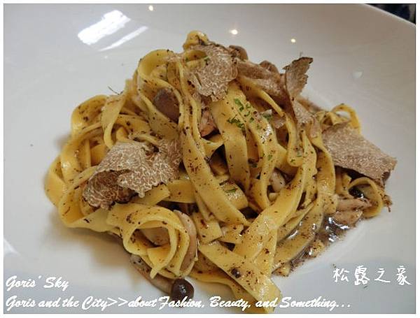 另一道主餐是用松露橄欖油清炒塔莉雅寬麵,同時拌有秀珍菇、鴻喜菇、美白菇等各種菇類,最後,和剛剛的燉飯一樣,上面再加上大量的新鮮現刨松露,所以價格同樣也是不斐。由於是松露橄欖油清炒過後的寬麵,味道比較重、也比較鹹,儘管這個塔莉雅寬麵是好吃的,有嚼勁的,但真要在這道塔莉雅公主野菇松露麵吃出松露本身的特點,相對是有限的。