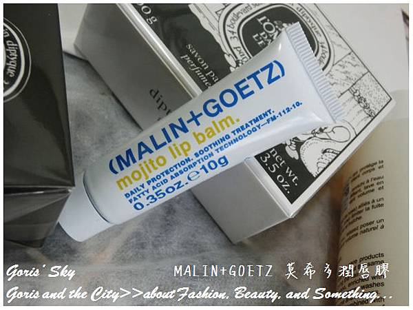這個算是朋友推薦我才意外發現好用的好物,強調平衡、簡化,只給肌膚最好的MALIN+GOETZ ,包裝看起來就很單純、樸實,實在不會太吸引人,不過這護唇膏真的可以買,本來以為它是膠狀,會不會擦起來很無感,但它的質地很特別,擦起來當下很水,但又能迅速滋潤雙唇,隨即馬上在雙唇上會形成一種薄膜感,然後就能長時間維持雙唇的潤澤感,對我這雙唇非常容易乾燥的人來說,也能維持得相當久,蠻好用的,而MALIN+GOETZ 共有兩款潤唇膠,包括這款莫希多潤唇膠外,還有修護潤唇凝膠,主要使用是一樣的,差別就在於莫希多潤唇膠是有味道的,修護潤唇凝膠是無味的,不過你要問我莫希多潤唇膠的味道是什麼,還真的有點難以形容,也不是太明白為什麼要取名調酒的mojito,但擦起來也不是萊姆味,這我沒多問,不過它確實是好用的。