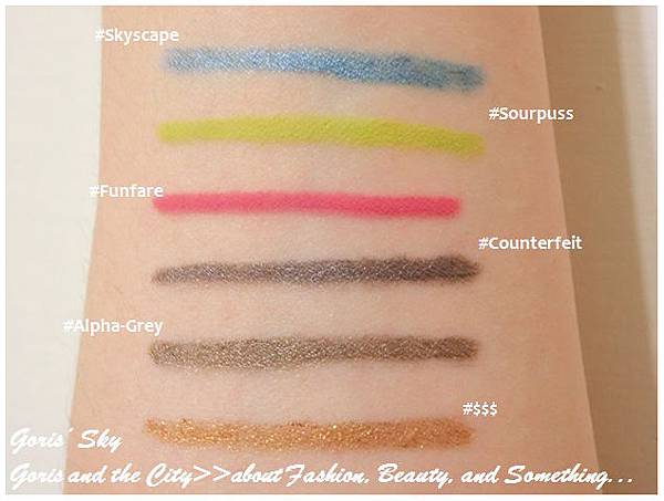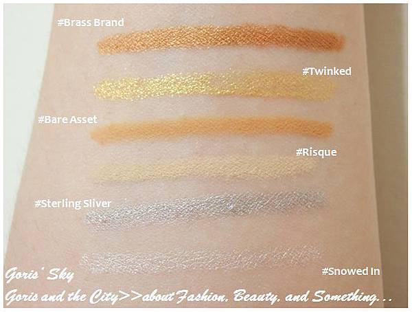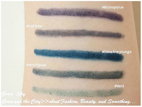 #Skyscape(常態):很漂亮的金屬天藍色,好想拿來當原子筆,顏色很好看,不過用在眼影上,還是有點試驗,但我覺得天藍的金屬色,已經比單純的藍色好用很多了,用來點綴會不錯,不然就是要深藍,如果介於天藍和深藍之間的藍,那就真的會很頭痛了 ...