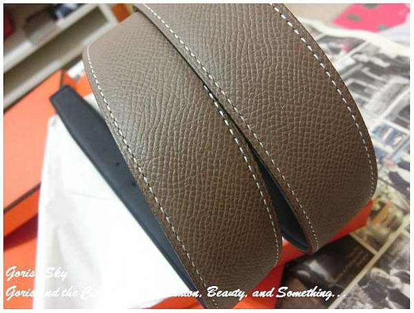 皮革是公牛皮製成的clémence(簡稱TC),顏色是帶點灰褐色的Etoupe Grey,算是HERMES比較經典的灰褐色調,特別是在此面車上的白色線條,能讓整個皮帶看起來更加的年輕、活力。