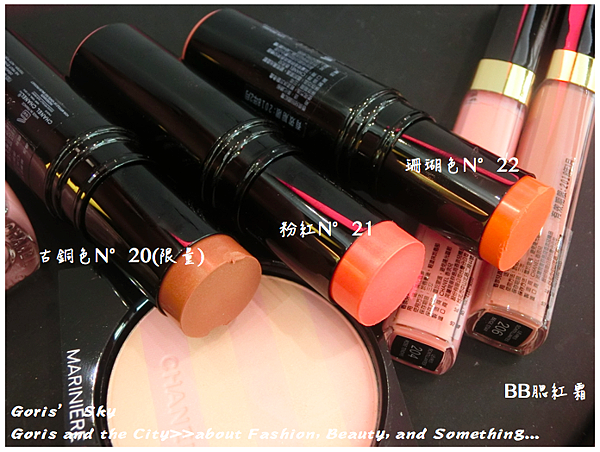 這次一個米色時尚注目新品,不外乎是這個BB腮紅霜,也是CHANEL第一支腮紅棒,8g的棒狀腮紅,大概可以塗到天荒地老,三種色調,包括古銅、粉紅和珊瑚色都有,限量的只有N°20,畢竟是古銅色調,不會有太多人買,所以貨訂的少,乾脆做限量。