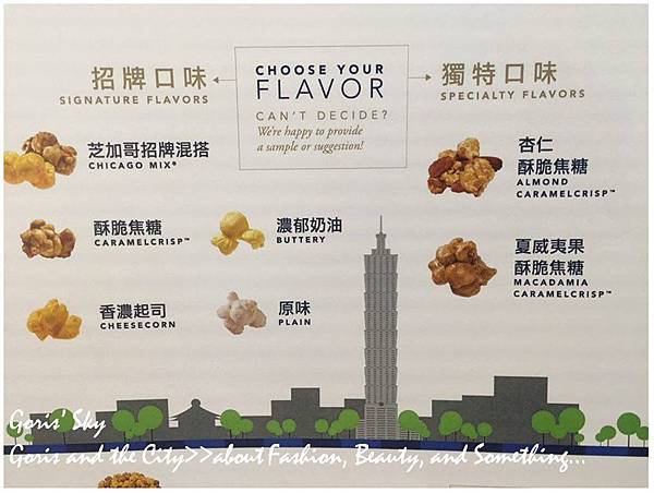 這次garrett在台灣開幕,一共有7種口味,分別是芝加哥招牌混搭(CHICAGO MIX)、酥脆焦糖(CARAMELCRISP)、香濃起司(CHEESECORN)、濃郁奶油(BUTTERY)、原味(PLAIN)、杏仁酥脆焦糖(ALMOND CARMELCRISP)、夏威夷果酥脆焦糖(MACADAMIA CARAMELCRISP)!價錢隨口味不同,也略有不同,完整價目如下: