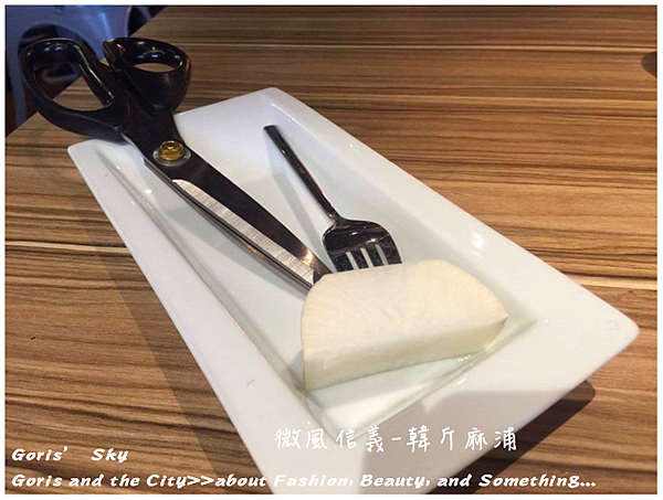 然後,韓斤麻浦會給一個這個器具,剪刀以及叉子插著蘿蔔這樣,一開始會有點不清楚是啥意思,後來才知道是用來清鐵盤的,也就是你每烤完一輪肉,要用這蘿蔔"嚕"鐵盤,才能把黏在鐵盤上的焦給去掉,也能比較烤得乾淨。