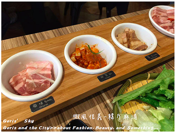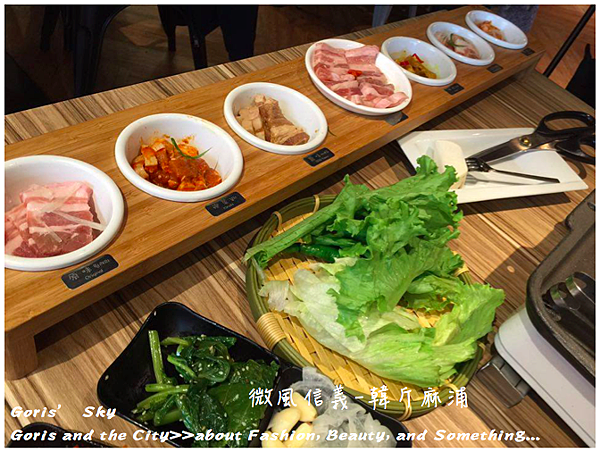 烤的時候也就是這樣都已經切片好的擺放,忽然有點覺得附的剪刀好像也派不上什麼用場,我是覺得韓斤麻浦的肉太薄,吃起來像肉片,不那麼像豬五花,其他韓國烤肉店,大多豬五花比較厚,吃起來紮實,也更有嚼勁,單就這點,我就覺得韓斤麻浦沒那麼正統,吃起來也比較不貼近韓國烤肉,但也不是說不好吃,而是就不是經典,切得過薄,吃起來也就沒那麼過癮。
