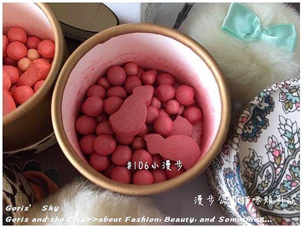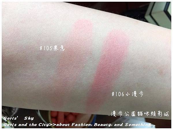這次的限量漫步公園貓咪頰彩球一共兩色,包括帶珊瑚橘的#105小寒意,以及粉紅色的#106小漫步,兩款限量漫步公園貓咪頰彩球其實都是由三種顏色所組合而成,像是珊瑚橘的#105小寒意,大顆的腮紅球粉紅般的葡萄色,小顆的腮紅球則是黃珍珠般的顏色,貓咪的部分則是一種黃粉色,三個腮紅球這樣混刷起來,就是上方照片這樣的#105小寒意的健康元氣珊瑚橘色調,這顏色我自己是蠻喜歡的,底妝如果打得好的話,輕輕刷上就是很自然的健康膚色,實用也好看;此外,粉紅色的#106小漫步雖然看起來就都是粉紅色,但其實也是由三種不同顏色的腮紅所組合而成,大顆的腮紅球帶有點紫紅感,小顆的腮紅球則是有些粉米色,貓咪的部分則是柔和的誒瑰色,混刷後就是#106小漫步的浪漫粉紅,對於一般女孩喜歡比較顯色的腮紅的話,這色就會比較適合些。