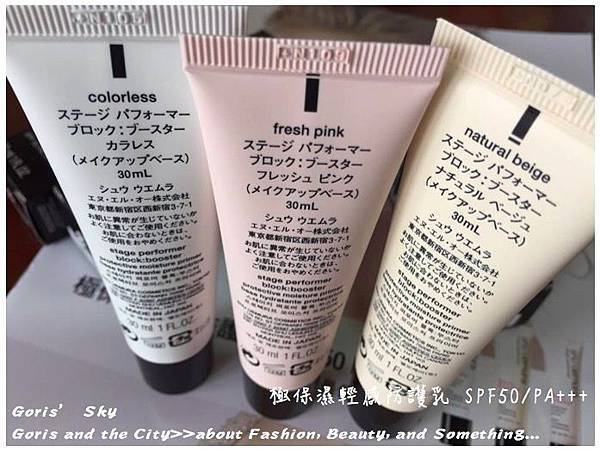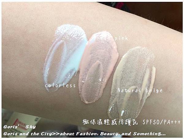 基本上,colorless就是無色,同時作為透明色,Fresh pink就是粉色、Natural beige就是米膚色,植村秀是強調這一瓶就能取代隔離霜,同時達到膚色校正,並且全臉使用,這也確實,一般來說我們會希望隔離霜輕薄卻又水潤,防曬係數最好要高,但總是會貪心的會想在粉底前再加一些妝前乳調色,但這類型的調色妝前乳,過往因為色料的添加,常常都比較濃潤、厚重,層層疊疊下來的底妝,自然就比較厚,植村秀新的這款極保濕輕感防護乳,單是看質地試色,就會發現其相當水潤,但又不似泡沫慕斯那麼輕盈的彷彿無存在感,而且極保濕輕感防護乳的三個顏色,無論是透明色、粉色、米膚色,色系上其實都是"亮"的,就算全臉擦也不會因為某些部位的不適合而過於遷就,其水潤、同時明亮的色調,確實很能夠一瓶取代隔離霜以及妝前調色乳的需求。