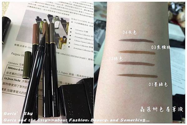 一般來說,我們很好分眼線筆、眼線膠筆、眼線液等 ... 差別,但比較少去分眉筆、眉筆液、眉粉、眉采膏等 ...,但其實大體上來說,是一樣的概念,筆狀彩妝好描繪,適合暈染(但也因為適合暈染,所以如容易暈),所以可能就要轉換成液狀,膏體等 ...,所以SUQQU有這樣的眉筆液,反而是在眉型的描繪優勢上,多了更多的優勢,因為液狀的晶采妍色眉筆液,會比較貼合肌膚,同時也不容易暈染跟防水,又加上是液狀直接貼合肌膚,所以添加的保養成分也能在晶采妍色眉筆液上色後,同時保養眉部肌膚,基本上,使用就是跟一般眉筆一樣,先描繪打底,再用像是晶采妍色眉采膏去順眉流,4色顏色其實都很自然,不會很突兀,就是看你的髮色、膚色去選。