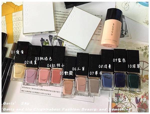 其中,最特別的是,原本都是強調洗鍊黑色的SUQQU在這一次限量夏妝,為了呼應夏季的舒緩和深呼吸的藍,首次將外盒改成全然潔白的純白色,我故意把原本既有的晶采立體眼彩盤放在一起比較,就能很清楚看見完全是黑白色的對比,但不變的共同點都是一樣鑲著金邊,這都是在SUQQU今年於晶采立體眼彩盤產品革新後,所做的改變,也為這一次夏妝限量的特別性、可收藏性,又錦上添花了些,此外,更大的重點是,晶采絕色指甲油也在這一次的產品更新下,全面升級,全新的晶采絕色指甲油除了包裝、造型質感都比過去更好外,質地上,也走出一種全新的SUQQU指甲油的視界,是以一種飽和,但是淨透的透明系甲彩為主要的革新,在理解這一次的限量夏妝-深呼吸的藍種種概念和特色後,你再去看試色會比較有感一點: