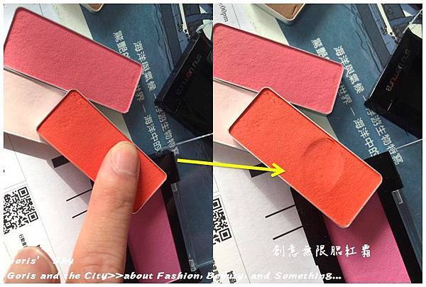 而這次全新推出的16色創藝無限腮紅霜,顧名思義就是霜狀的腮紅,但你可能會有一個既定印象是霜狀腮紅就是很濕、很厚,像是CHANEL的雪紡腮紅,你真的一摸就是濕!但倒是不然,你就先回想年初植村秀新推出的無色限粉霧保濕脣膏,就是可以粉粉的、霧霧的,卻很保濕,同時畫起來完全不會乾,還很絲滑,我有點懷疑,這次的創藝無限腮紅霜有一些技術應該也是和無色限粉霧保濕脣膏一樣,因為雖然質地摸起來也是冷冷的,但不是你一摸上去,就會一坨濕濕的沾染,就是你可以感受到他冷冷,有些濕濕的,但還是乾的,但用力去壓,還是會有些QQ彈彈的,一樣不是靠網子在彈喔,就是質地本身在Q彈,你看我壓的就會變右邊這樣。