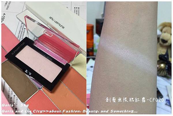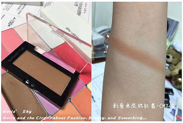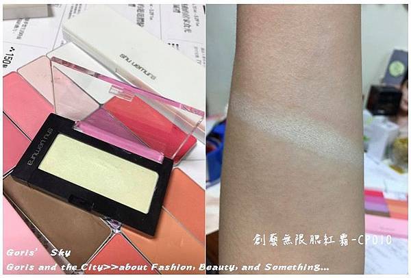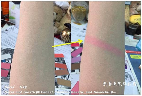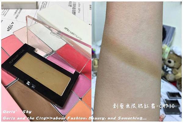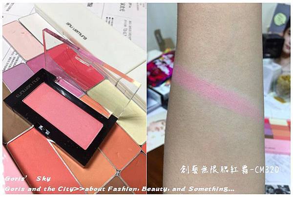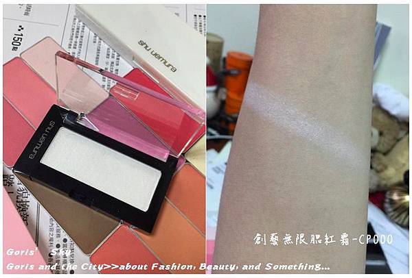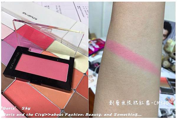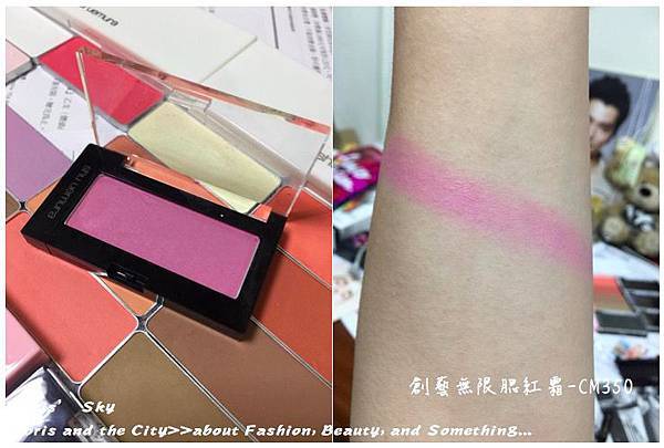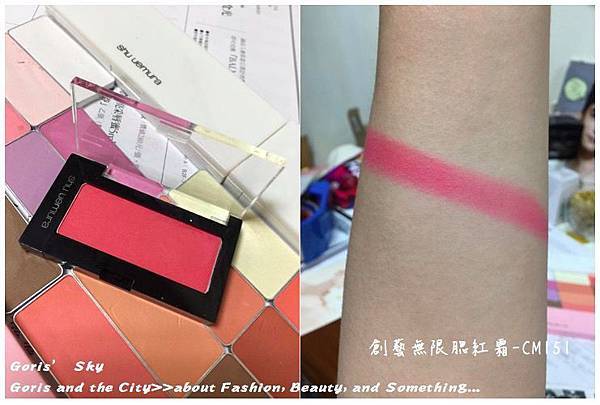 左邊的手臂是我先推滿一般的粉餅,看就會很粉,同時比較粉霧感,因為我的目的是要實驗是否能夠讓這植村秀的創藝無限腮紅霜在粉餅這樣的乾粉粉體後使用,也也能自然不結塊,但在粉餅後,我去試色植村秀的創藝無限腮紅霜,還是很滑順,同時也是很自然發色,不會結塊,顏色還是很透的很自然,其實單是這樣的技術,就在這樣一個平凡的小小腮紅霜中,可見一斑,我覺得這要你自己去試了才準,因為通常霜狀、液狀的腮紅,絕對是要粉底液後、粉餅前使用,不然就是容易結塊,不好看,但如果你習慣用粉餅,甚至是蜜粉紅才上想刷腮紅,倒是這植村秀的創藝無限腮紅霜是成立的,所以你在櫃上試的時候,當然粉底液後用是ok的,你可以特別嘗試一下,粉餅後再刷這植村秀的創藝無限腮紅霜,就會比較知道有沒有。