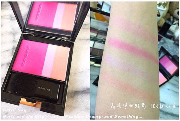 晶采淨妍頰彩-104紅小豆BENIAZUKI 是一種一次橫跨蜜桃色、櫻粉色、桃紅色所組合成的三階腮紅色彩,新明、鮮活,同時引人注目,混刷一抹,呈現出一種爛漫的糖衣粉色,有一種華美卻又神秘的獨特印象,就實用度來說,我是比較愛103亞麻茶AMACHA ,但如果你要特別一點,同時更大膽自信一點,就主要考慮104紅小豆BENIAZUKI。