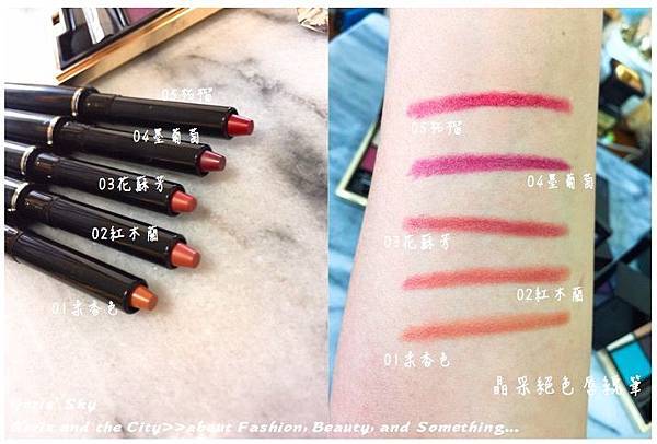 關於這晶采絕色唇線筆共有5色,從褐裸的01柔香色YAWAKOUIRO、到開始有些紅潤,但又維持在一個紅褐色的02紅木蘭BENIMOKURAN,這2個顏色都是比較搭配你一般裸色的唇膏色調,如果是一般的紅唇,就可以從03花蘇芳HANASUOU開始試,顏色是更明亮、大膽的紅色的話,就直接從05柘榴ZAKURO去挑配來搭,同樣的,雙唇唇彩若是比較帶紫色、桃莓色感的,就是從04墨葡萄去選擇來搭配,基本上,唇線筆的選擇,就是在同樣唇彩的色料框框下去挑同色塊的色彩,因為唇線不是在做撞色,而是在防止唇彩暈染,同時要自然呈現出一種微霧,但又能自然融合的色調。