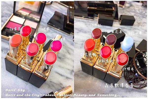 這次全面更新的晶采艷澤唇膏 ,一共全12色,2色為限量色,最最大的更新除了外型有所變化以及質地升級外,最主要是將色彩的整個色階、彩度做了重新調整,基本上,從01到10,你就當作是由攞到深的一整個色階,而這次全新的晶采艷澤唇膏 主要就是在光與影的概念下,去提升了基礎色的明度,創造剛光耀的明裸色,但又去降低深色的明度,打造出更沈穩的內斂質感色彩,會建議,單擦這晶采艷澤唇膏會是比較水透感的,但如果你想要比較飽和顯色的話,建議用刮棒刮一點下來,然後用唇刷,去均勻塗滿,就會很飽和但又透明水潤的好看。