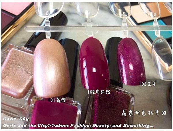 在原有的晶采絕色指甲油就比較沒有這種石榴鮮紅般的色潤感,毫無任何亮粉,卻很能映襯膚色,同時透出頗具魅惑,又不失甜美的透明色彩。