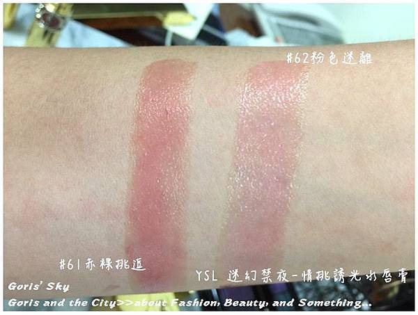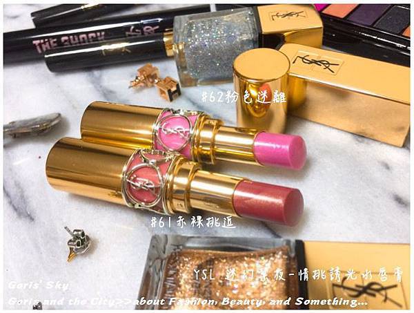 在這一次的YSL 2017限量秋妝-迷幻禁夜中,濃烈就讓給迷幻禁夜-奢華緞面唇膏了,真要日以繼夜都能使用的話,限量新2色的迷幻禁液-情挑誘光水唇膏 就會更適合,除了本來就很水潤、清透的質地外,#61赤裸挑逗是一種無聲仿有聲的裸色誘惑,單擦就是一種淡淡的自然裸暈,但又欲滴般的令人垂涎挑逗;#62粉色迷離倒是在看似無害輕裸的BABY PINK中,一抹就是華麗閃耀的七彩珠光亮粉,是一種很70年代的DISCO粉色。