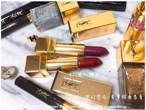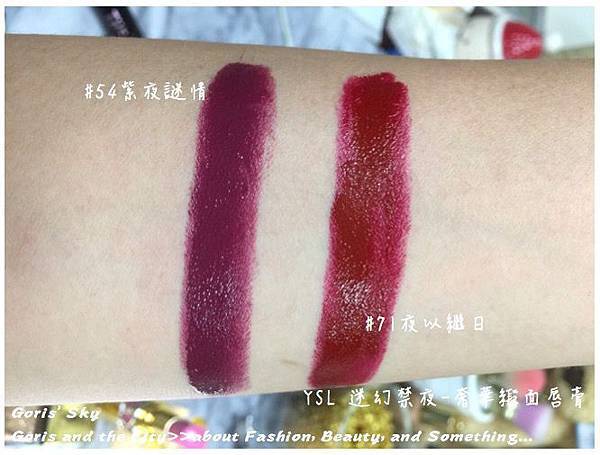 在這一次的YSL 2017限量秋妝-迷幻禁夜中,限量新2色的#54紫夜謎情透出的是一種最葡萄紫般的濃醇色彩,有點迷幻、迷濛同時性感;#71夜以繼日則是宛如微醺的香醇紅酒,讓人一吻就會為你醉倒,都是相當濃烈、濃厚的色彩,在這色彩之後,也都可以輕點上剛剛講的迷幻禁液-星鑽亮粉,以營造出一種粉紅鑽光的效果。