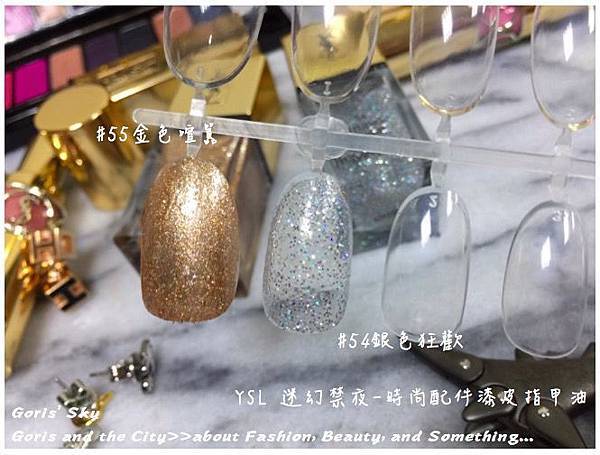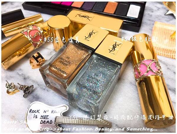 搭配YSL 2017限量秋妝-迷幻禁夜的概念,在YSL經典的時尚配件漆皮指甲油,則推出有點70年代復古搖滾的金色和銀色,透過宛如DISCO般的旋轉燈球所映射出的多彩珠光,然後投射在金色和銀色的質地上,形成最喧囂的金色,同時也是最狂歡的銀色。