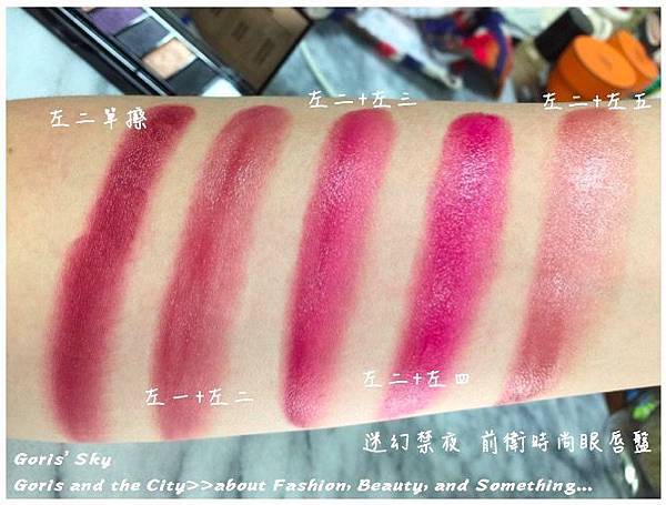 但是這次迷幻禁夜 前衛時尚眼唇盤 好玩的地方主要是唇彩間彼此能堆疊,特別是左二這色本來就是很時下流行的乾燥玫瑰色,這盤迷幻禁夜 前衛時尚眼唇盤 也可以說是這色最好看,你以這個色做為主色,除了單擦之外,去調和另外四種顏色,就能調出再多4種的乾燥玫瑰色,示範如下: