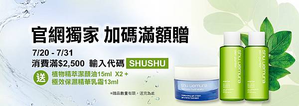 7/20-7/31 消費滿$2500,輸入代碼 SHUSHU 送植物精萃潔顏油15mlX2+極效保濕精華乳霜13ml