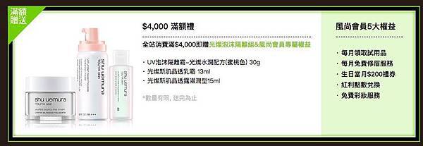 全站消費滿$4,000即贈光燦泡沫隔離組&風尚會員專屬權益 · UV泡沫隔離霜-光燦水潤配方(蜜桃色) 30g · 光燦新肌晶透乳霜 13ml · 光燦新肌晶透露滋潤型15ml