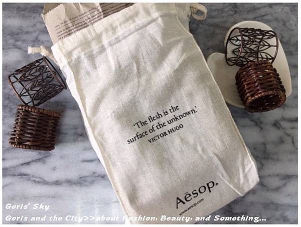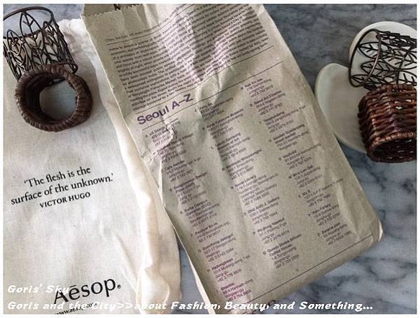 這次稍微提一下如果你有去買過Aesop,都會知道Aesop是沒有紙袋的,大多就是用這樣的再生紙所製成的紙袋,或是會直接用一個棉袋,就是要提倡環保之類,這棉袋其實蠻好用的,我之前如果拿到比較大的,就都會外出旅行時,用來裝鞋用,不然就是換洗衣物都ok。